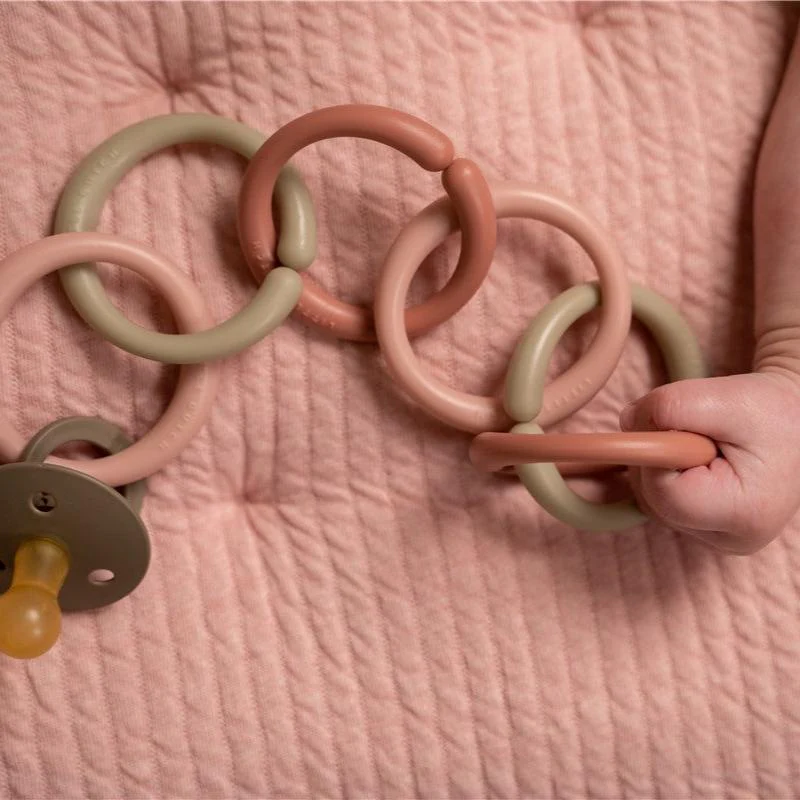Estas anillas de juguete multifuncionales son tus nuevos ayudantes favoritos! Úsalos para hacer una cadena y sujetar un librito suave al cochecito de su bebé, o para colgar su juguete favorito en el asiento del automóvil. Hay muchas maneras de utilizar estas anillas. Sea creativo y descubra por sí mismo lo prácticos que pueden ser. Están hechos de polipropileno (PP) sin sustancias nocivas. Esto los hace seguros para que jueguen los más pequeños. ¡Pueden parecer simples pero seguramente los mantendrán entretenidos!