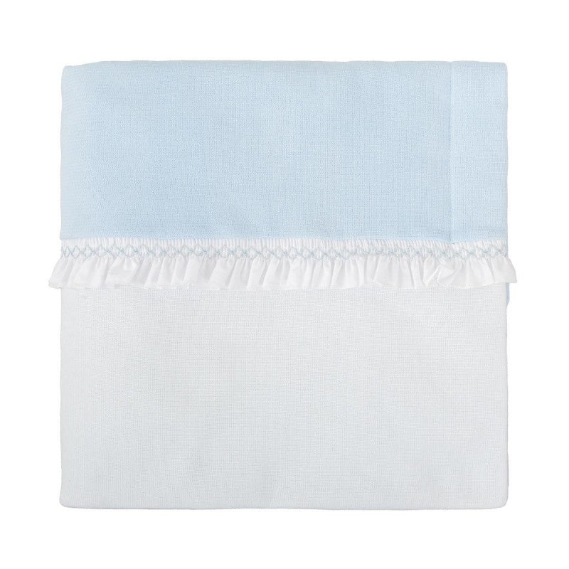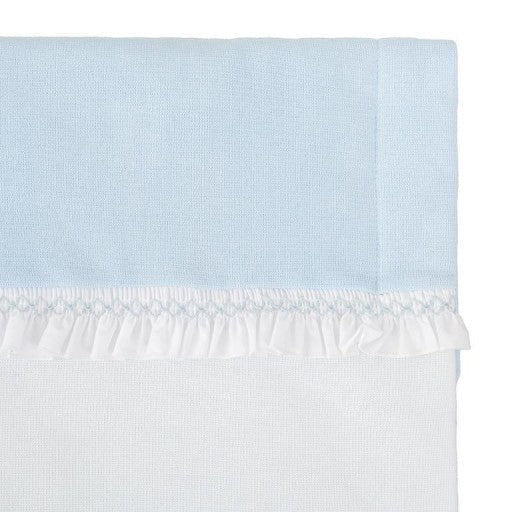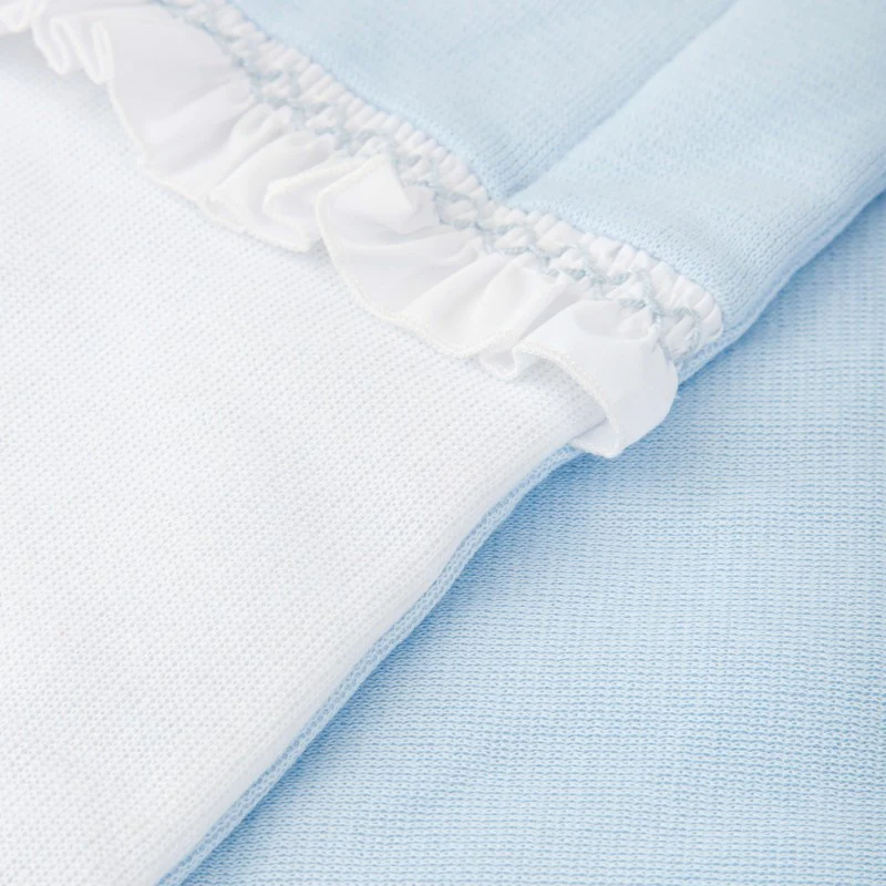Suave manta arrullo en color celeste para bebé en tono blanco con cabecero en azul celeste. Decorada con delicado bordado smock y una fina puntilla blanca, esta manta combina elegancia y funcionalidad para los momentos más tiernos del día a día.