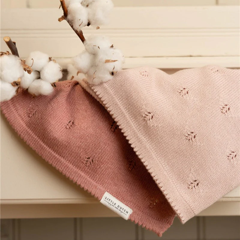 Manta de punto rosa para cuna tejida en punto pontielle.