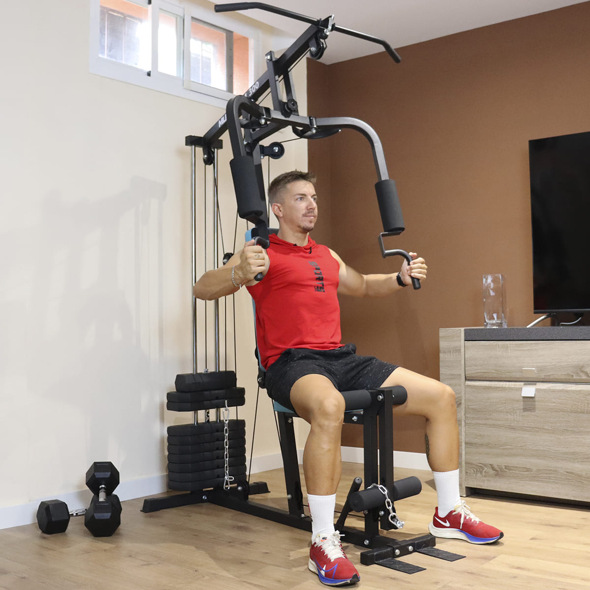 Prepárate para aprovechar al máximo tus sesiones de entrenamiento fitness con el Multigym 300 de musculación, diseñada para un ensamblaje sin complicaciones. Experimenta un confort garantizado en cada ejercicio, asegurándote un inicio suave y sin contratiempos en tu rutina de fitness.