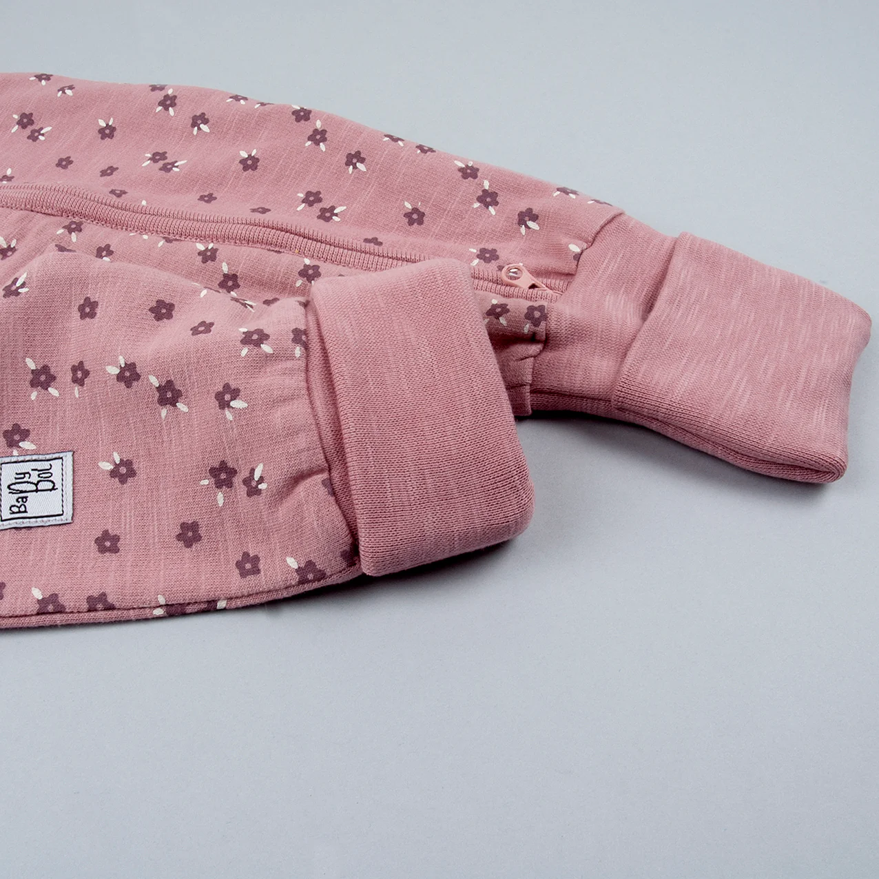 Pelele en color malva con flores muy cómodo de poner y quitar con doble cremallera. Los pies viene con patente que se puede cerrar para tener los pies calentitos.