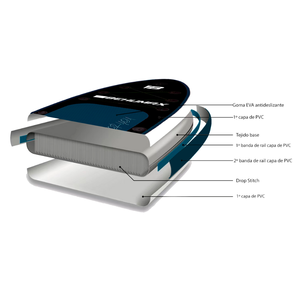 Equipada con un deckpad en goma EVA antideslizante, proporciona estabilidad adicional. Con una variedad de accesorios, incluido un soporte para Go-Pro y una mochila con alta resistencia que permite el transporte fácil de la tabla y los accesorios.