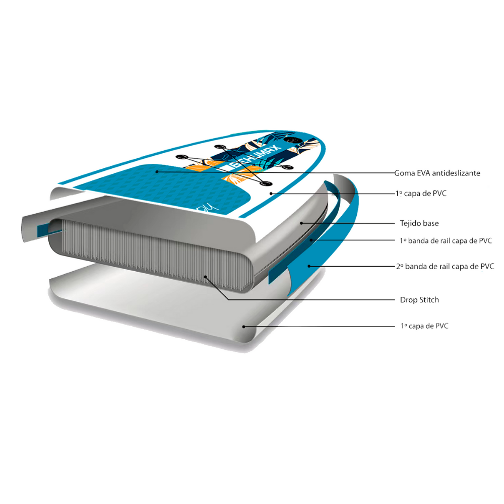 Cuenta con la innovadora tecnología Dropstitch con doble capa de PVC y grado militar para garantizar la mayor estabilidad y fortaleza. El deckpad está fabricado con goma EVA para una alta sujeción durante la navegación.